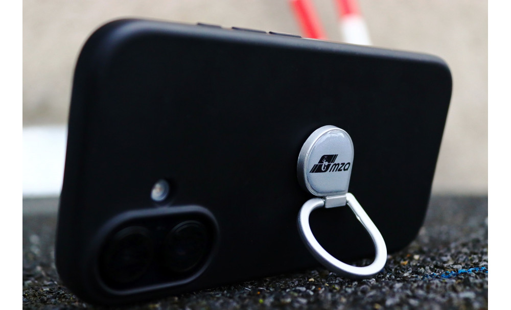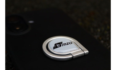 Uchwyt do telefonu z logo MZA typu ring holder/pop socket, który spełnia również rolę podstawki.